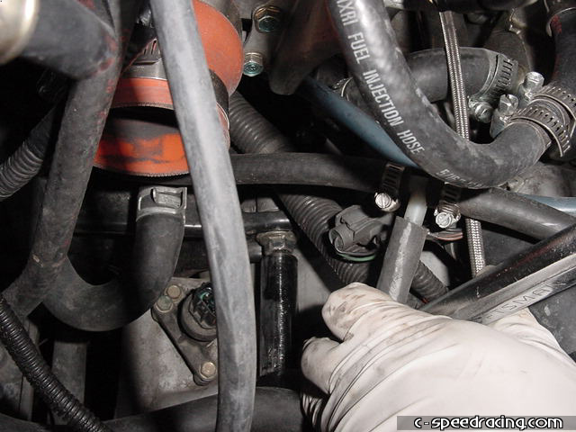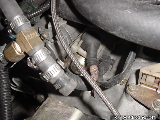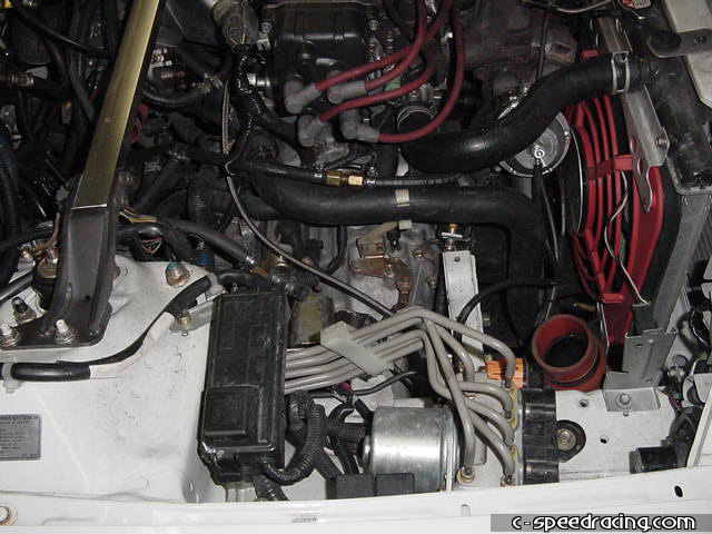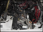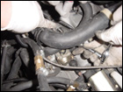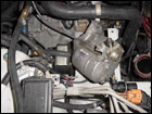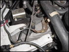 The first step is to disconnect all the wiring from the tranny. This includes ground straps on the transmission and starter as well as the VSS. To ease the process, removing the radiator and fan clear up some room for you to work. Make sure to drain the radiator first. A few preliminary steps have been skipped such as removing the axles and draining the transimission as well. You can also remove the front engine mount at this time. |