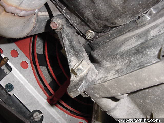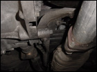 You can see that there are two 19mm bolts holding the rear mount to the tranny and there is an additional one that holds the mount to the frame. Be sure to remove them all and take the mount out altogether. |