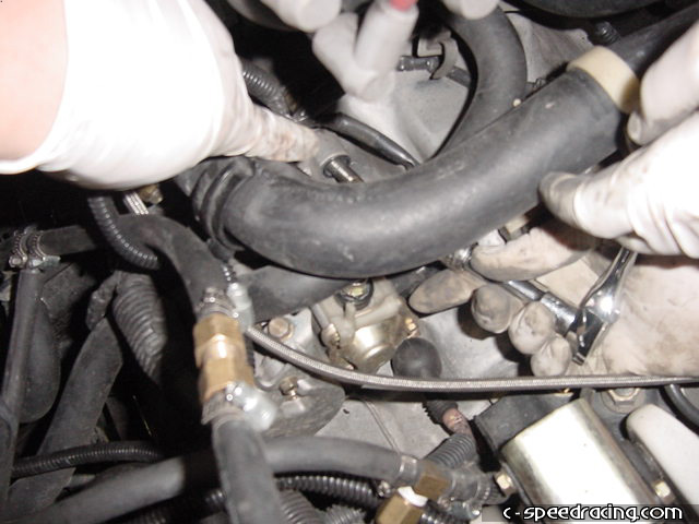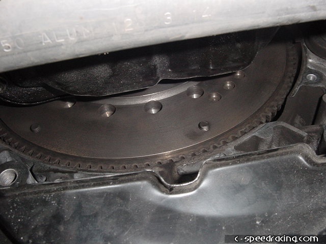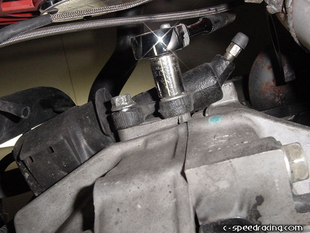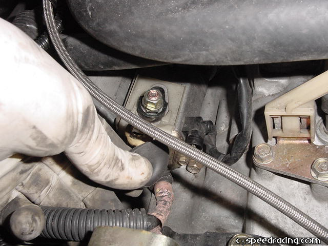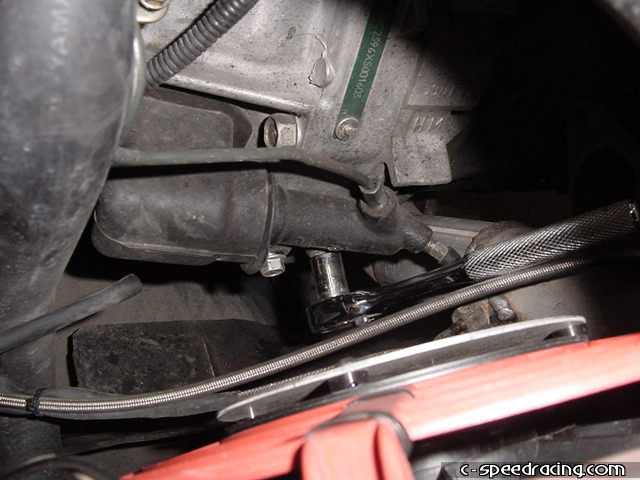 Remove the clutch slave cylinder as well. There are two 14mm bolts. Be careful not to crush or bend the lines when you are manuevering it around. |