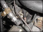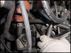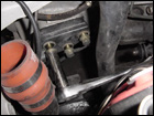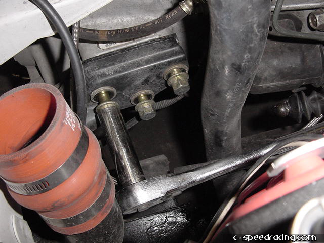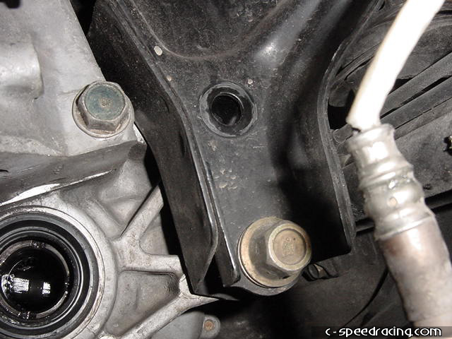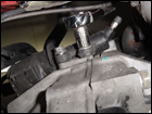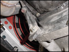 Once the starter is out, the only thing left is to disconnect the rear engine mount. Remove the upper bolt from the transmission. The three lower ones are under the car. |