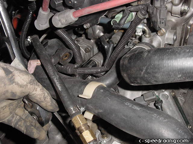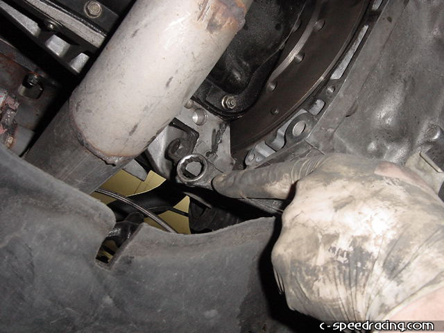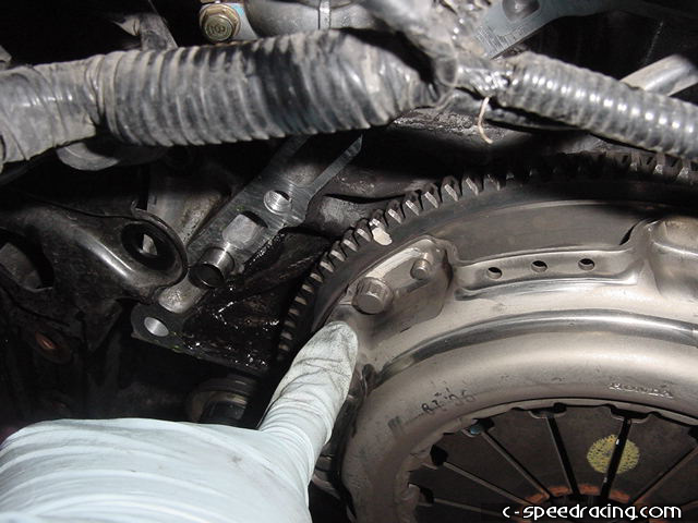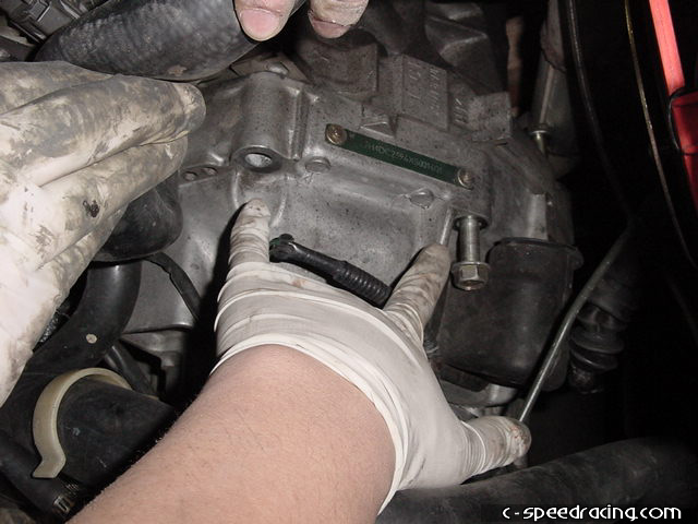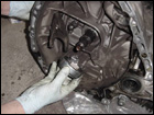 You're almost ready to drop the transmission. The only thing left now is to remove all the main bolts that hold the transmission to the block. You can access all of them from the top of the motor except for one. Be sure to remove this one that is below where the clutch slave cylinder normally goes next to the flywheel cover from under the car. |