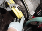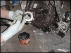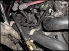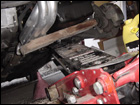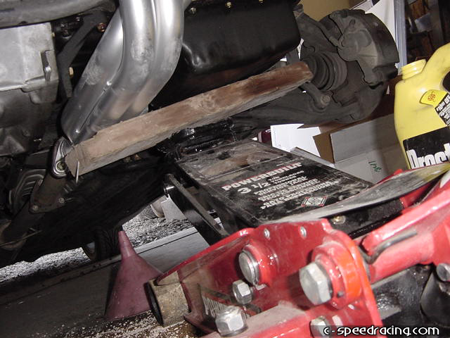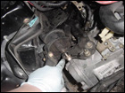 Once that has been done, you can start to unbolt the rest of the 17mm bolts from the tranny. Be sure to place a jack under the motor to hold the engine up as you will be removing the passengerside upper engine mount. |