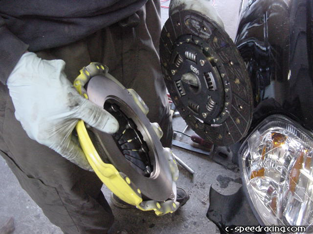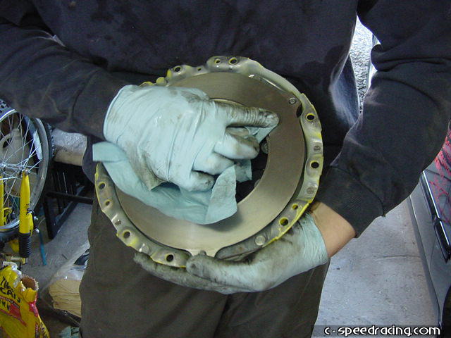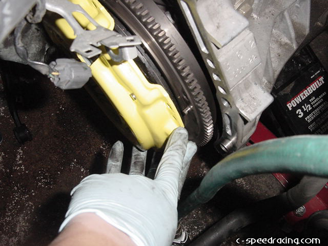 Once the clutch and pressure plate have been removed it is a good idea to remove the flywheel at have it resurfaced. However, this motor had extremely low milage on it with its current clutch and there were no signs of wear or hot spots on the flywheel so we opted to leave it. With the new pressure plate and disc, make sure to clean off any oil that is on the pressure plate and flywheel before installing. The disc can only fit one way into the pressure plate, so don't worry about messing that up. |