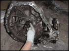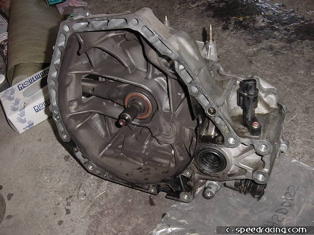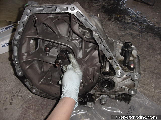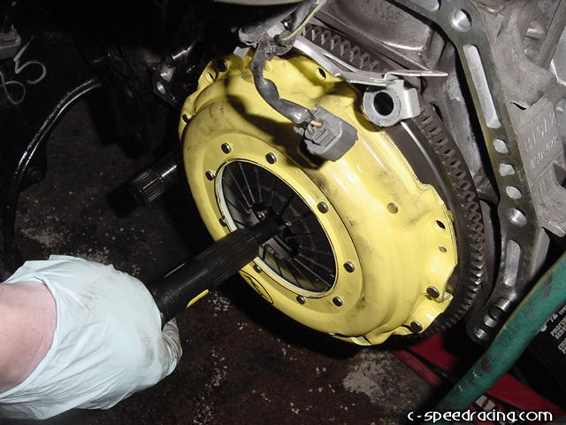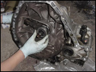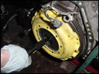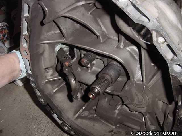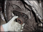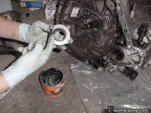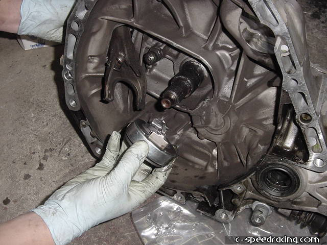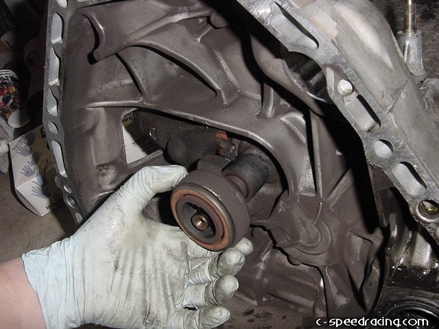 Now for the throw out bearing. Remove the old bearing by pulling firmly until it slides off the input shaft. |