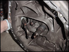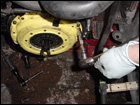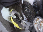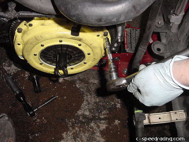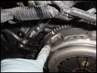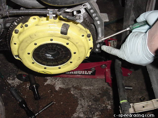 Once the jack is in place, remove the engine mount and slowly let the motor drop down by lowering the jack until the motor sits sideways in the engine bay. Then with the aid of a friend or two, have someone crawl under the tranny while another person separates the transmission from the block and carefully lower the transmission to the ground. Its not that heavy, approximately 50lbs or so. Now that the tranny is off, you will notice that the pressure plate is held in place with a series of 12-point 10mm bolts. Remove them witha 12-point 10mm socket. |