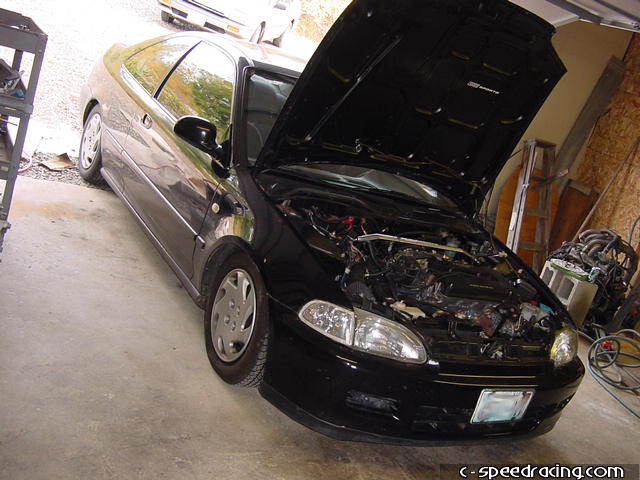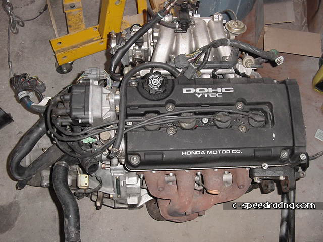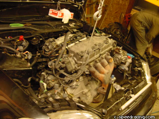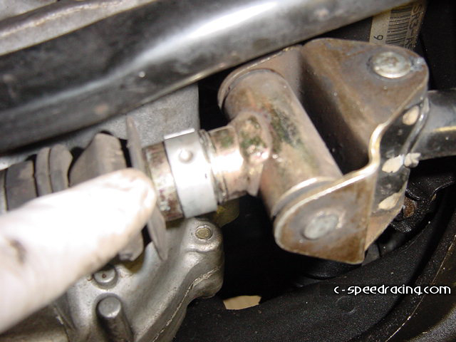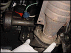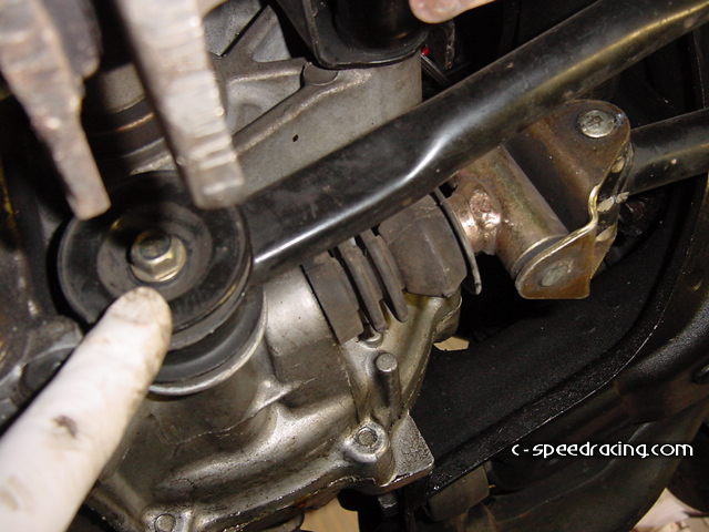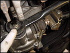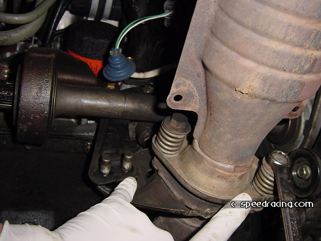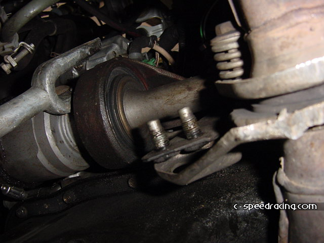 Step 7: Now you can detach the cat from the header and hanger. And while your down there, remove the shift linkage and stabalizer bar. You'll need to swap it out for the GSR counterpart. |