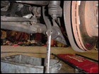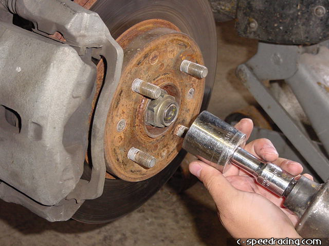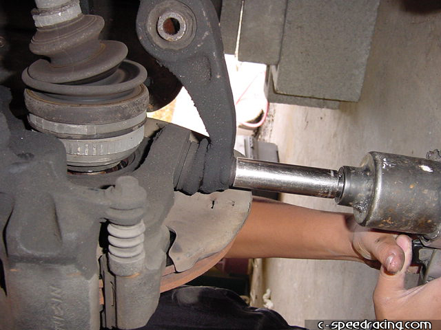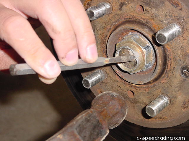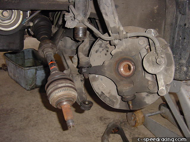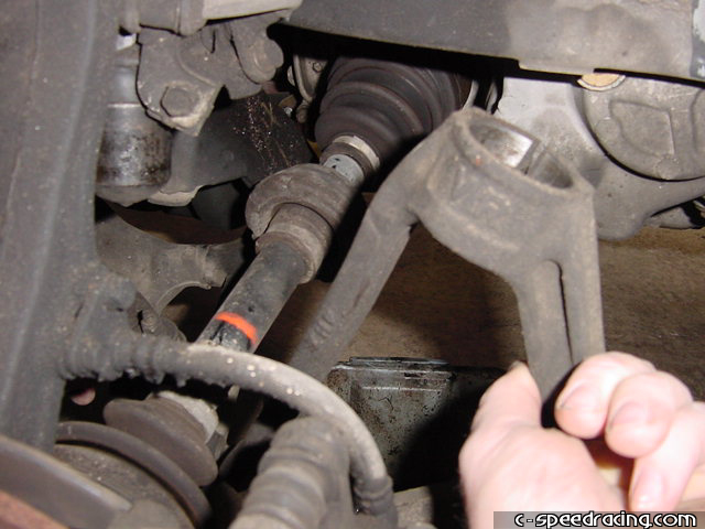 Step 1: After jacking the car up and placing it on approved jack stands, take off the front wheels and your first order of business will be to work on the underside of the car. Get the hard part taken care of first, and that is removing the axles. Using a punch, make sure you straighten the tab on the 32mm nut before trying to remove it. |