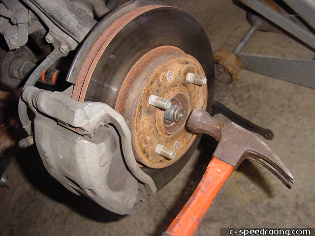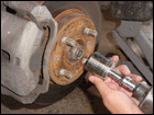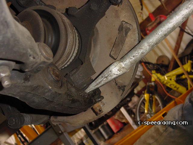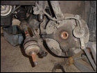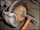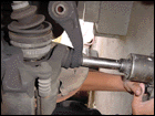 Step 5: If worst comes to worst, grab a ball join splitter if you have one. Luckily we did. Once its off you can pull the hub assembly off of the outter axle. Help it out if you need to by gently hitting the axle with a hammer. |