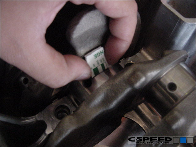 Repeat the step for the cap side and then carefully place the crank into the block. Make sure the crank journals are clean and then place a strip of plastigauge onto the crank journal and install the cap you are measuring. Measure one cap at a time. |