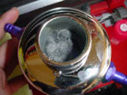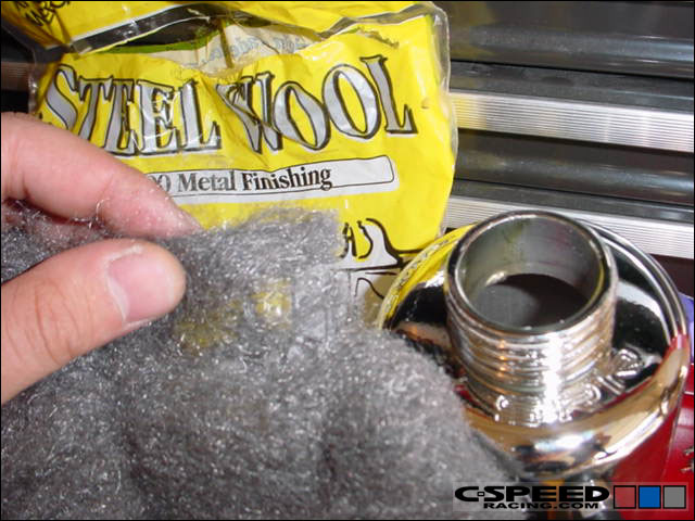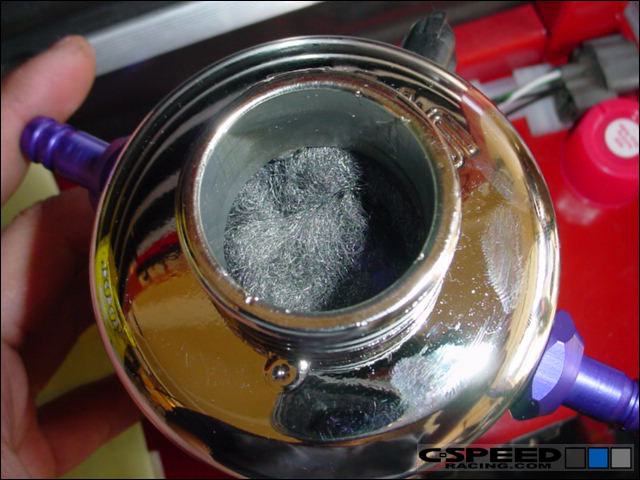 Since the SSR unit isn't baffled internally, we went ahead and filled it full of steel wool. The steel wool will act like a filtering element so as the oil vapors pass through the catch can, they will be filtered out better. |