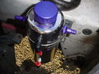If your motor didn't have an original PCV system, then run one line from the nipple you installed on the back of the block to the catchcan and then run a vacuum line from the catchcan to the intake manifold. Once the lines have been run, secure them in place with soem zip ties. Make sure there are no kinks in the new lines and be sure that there are no vacuum leaks. Enjoy the new filtering setup. |