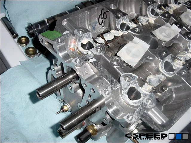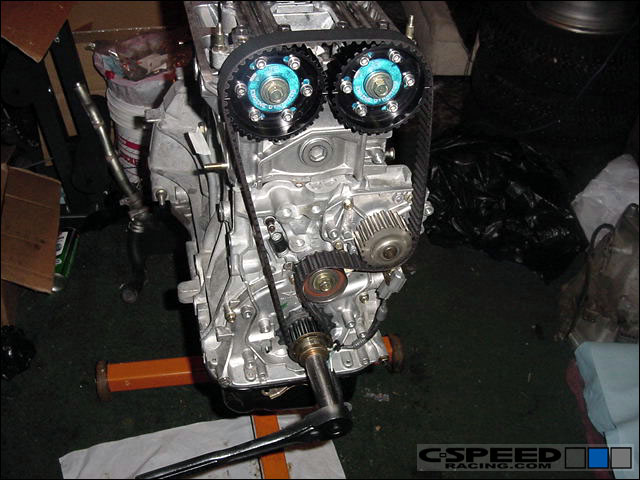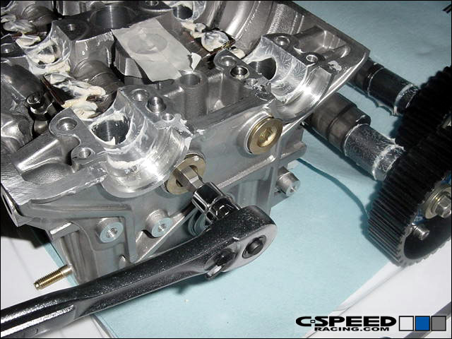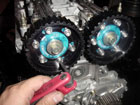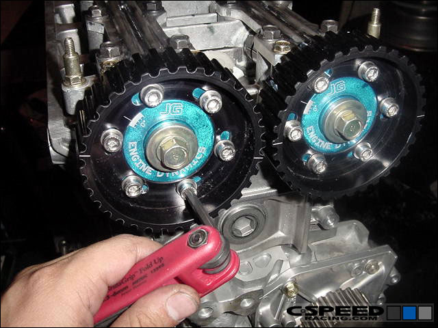Now you can carefully set the head in place and torque the bolts down. Assemble the cams as you normally would. A valve adjustment isn't necessary. Put your cam gears on and if they are adjustable ones, then set the intake and exhaust gear to the highest advance/retard that you foresee using. For example, if you foresee a maximum setting on the intake gear to be +5 degrees and -6 for the exhaust then set it as so. |