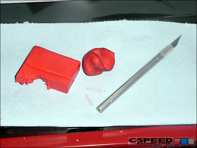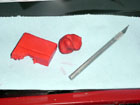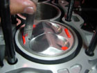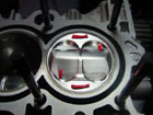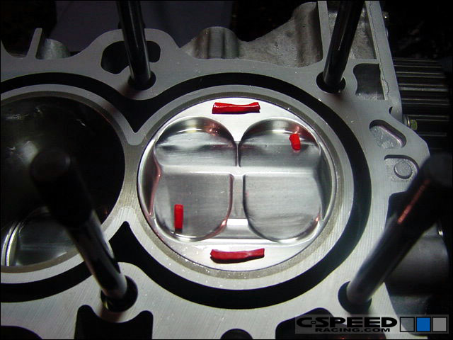 Cut the clay into small strips about 0.50" x 0.10" x 0.10". You'll need four of them. Place each strip of clay onto the piston. One on each quench pad and one on each intake and exhaust valve relief - slightly off center. |