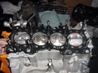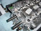 Now place the used gasket onto the block. Before setting the head into place, you must dissassemble the rocker arm assembly for the cylinder that you are going to test on (#1 cylinder) and switch the VTEC pistons in the rocker arms so that it locks the VTEC rocker in place. You don't need to dissemble the entire head, just slide the rocker shaft out far enough so you can remove and install the rockers on the #1 cylinder. |