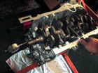 First thing is to put the new crank bearings into the block and caps and install the crank and main caps. Make sure you also install the thrust washers. Then find a suitable mouting point for the dial indicator and position it like so. Zero out the gauge and then using a large slot head screwdriver, pry on the crank between the #3 main cap and counter weight in both directions. Make sure that it is within spec - replace the thrust washers if necessary. |
