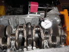 Next, remove one main cap at a time and position the dial indicator to measure the crank journal. Zero out the gauge and then rotate the crank slowly and watch the gauge to make sure that the crank journal is true and round. Do the same for all the crank journals. If they are out of spec, then a new crank is required. |
