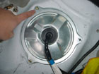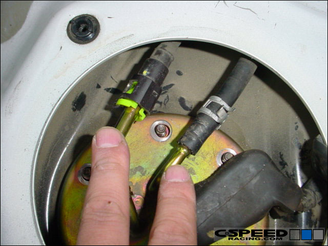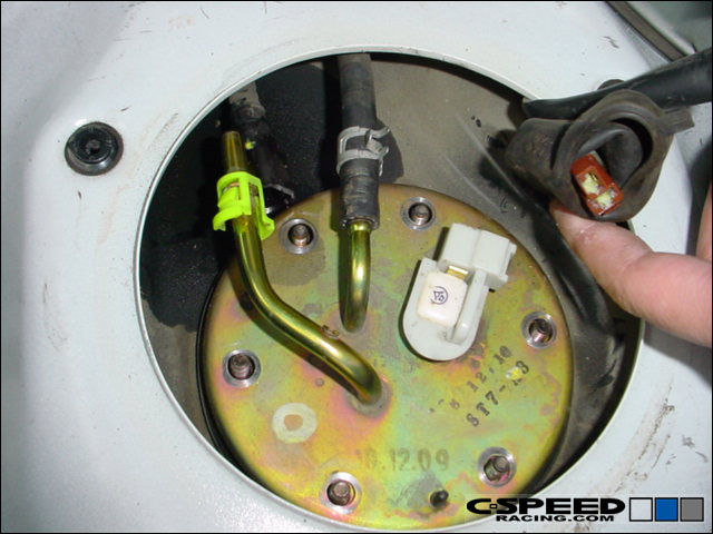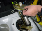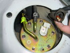 You can then pull out the fuel pump by lifting on the lid. It may take some jiggling to get it out. Be sure to have some towels ready to catch the leaking fuel. First disconnect the wiring from the fuel pump via the connector. |