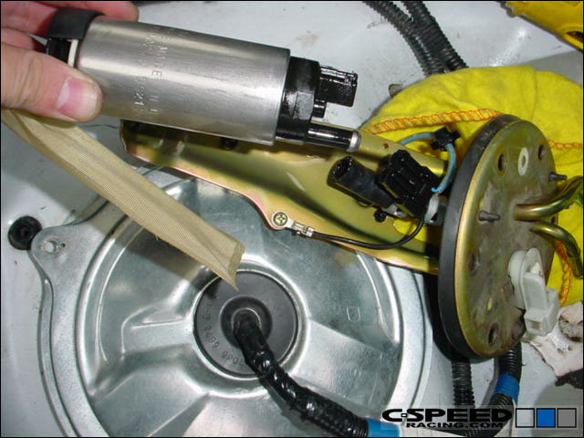 Pull up on the lower end of the pump to remove it from the metal housing. Once it is free from the lower metal collar, you can disconnect the fuel line from the pump. Now place your new pump in place and reverse the directions to put it all back together. Enjoy. |