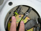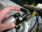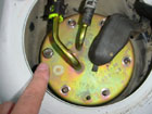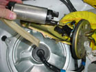 Now disconnect the fuel lines from the lid. One of them is snapped in place and can be removed by seperating the inner plastic clip first, then pull off the line. You can now remove the fuel pump wiring under the black rubber boot. Disconnect the wires by pulling the connector. |