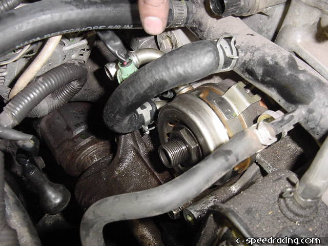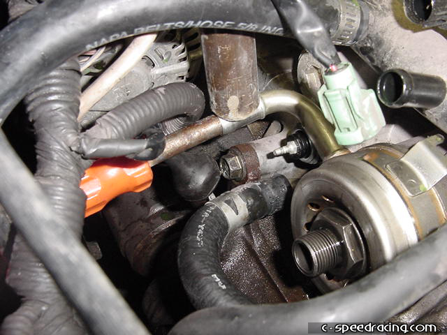 Using the new supplied water line, connect the upper nipple on the oil cooler to the back of the block. Now you can go ahead and loosen the bolts on the alternator. There is one on the top and one on the underside on the back of the block. |