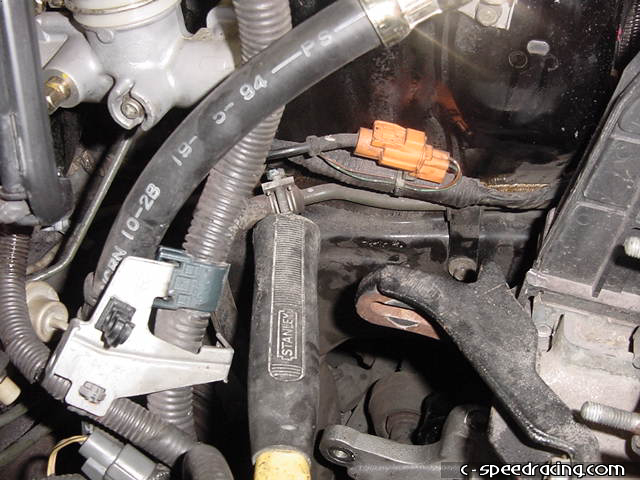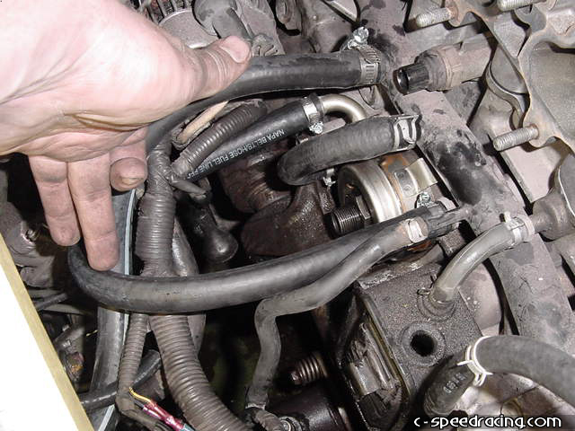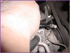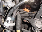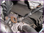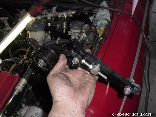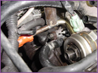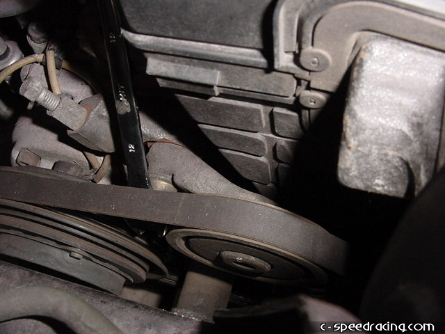 Now you will need to slightly bend the powersteering line on the driverside of the car on the fender. Using a long handled hammer or equivelent, push the metal line towards the fender as much as possible. This is necessary to clear the new belts that will drive the supercharger. With that done, you can now install the new pulley bracket to the back of the block. |