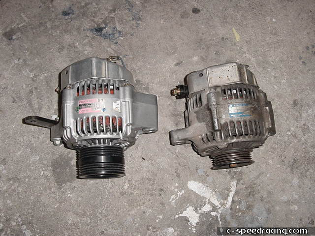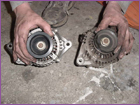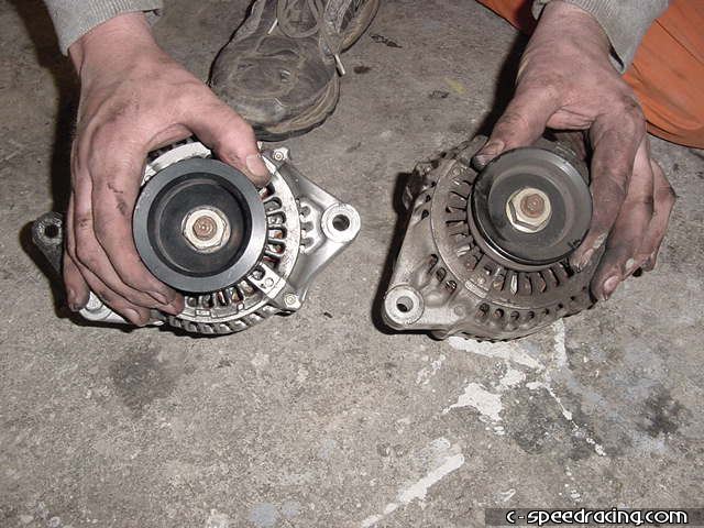 Here you can see a comparison of the stick alternator pulley and new JRSC pulley that will drive the supercharger. An impact wrench will come in handy to remove the bolt on the alternator for you to swap pulleys. |