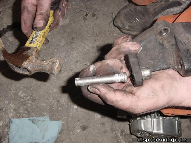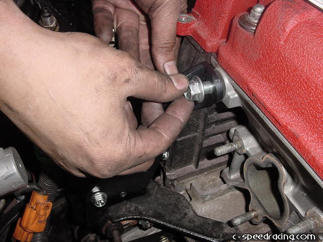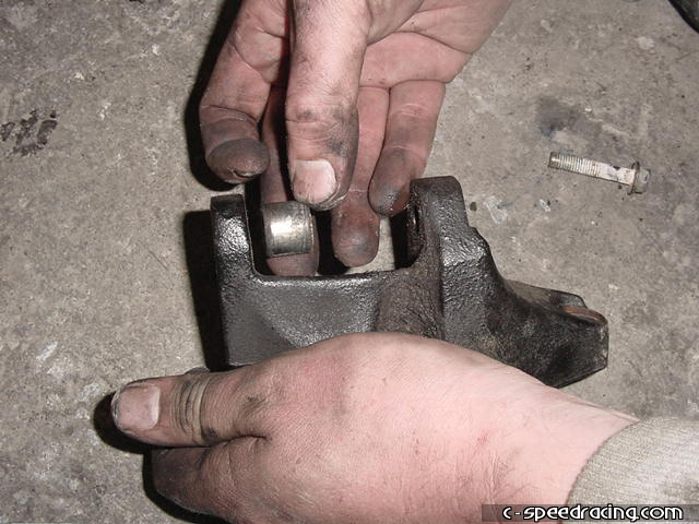 Using a punch, remove the bushing on the stock alternator bracket and install it onto the new JRSC bracket. |
