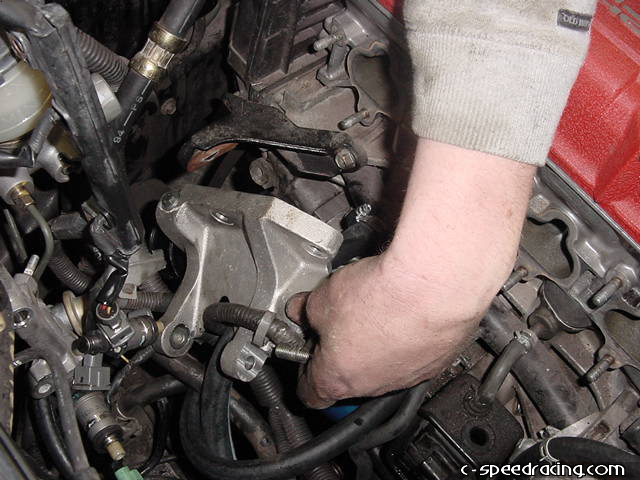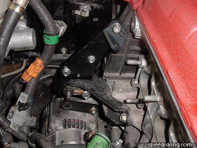 Using the supplied bolts and spacers, bolt the alternator back to the new lower bracket and to the new upper pulley bracket. Then finish up by bolting the support bracket to the head with a 12mm bolt. |