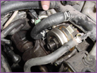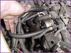 Reinstall the oil cooler onto the back of the block. However take note of the position of where the upper nipple is. It now has to point at the 9 o'clock position. It originally pointed in the 12 o'clock position. This is vital that it points at the 9 o'clock position for clearance issues. The nipple must also be hoziontal the to floor or pointing slightly upwards, if it doesn't, then carefully bent it by inserting a screwdriver. Using the orignal hose on the oil cooler with the largest radius, reconnect the lower nipple to the main water line. |