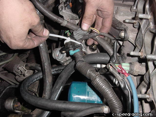 Now you will have to relocate the main engine harness. Move it as close as possible to the block. Run the engine harness underneath the PCV line. Again this is vital for clearance issues. |