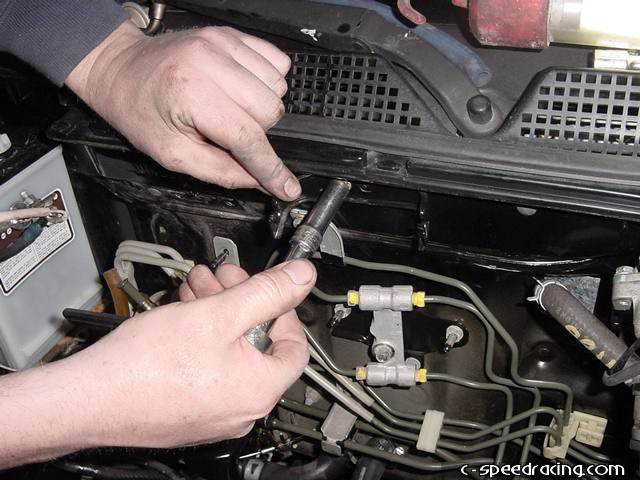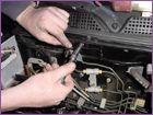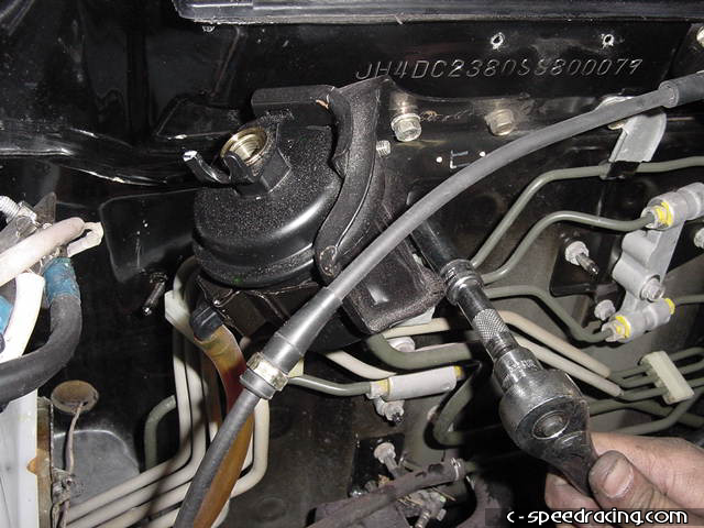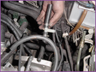 With the solenoid removed, reconnect it to the harness and zip tie it securely to the engine harness. Now remove the fuel filter from the firewall. |