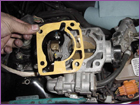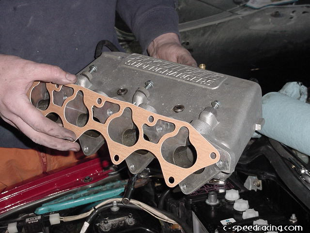 Remove the throttle cable bracket from the firewall. This will give you more room to install the JRSC manifold and charger in the following steps. You can see here the JRSC manifold and a new intake gasket. It is good idea to coat the gasket with a little oil on both sides, this will allow you to reuse the gasket in the future if you ever need to take if off again. It will prevent the gasket from sticking to the manifold or head. |
