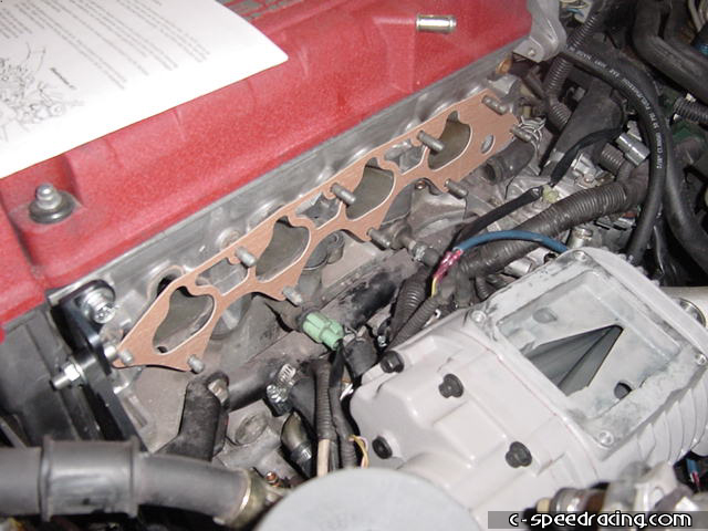 Put the new intake gasket onto the head and lower the JRSC manifold into place. The manual says to install the charger after the manifold is in place, however we decided it was easier to lay the charger down first and then install the manifold. |