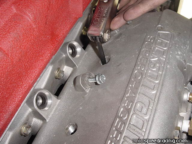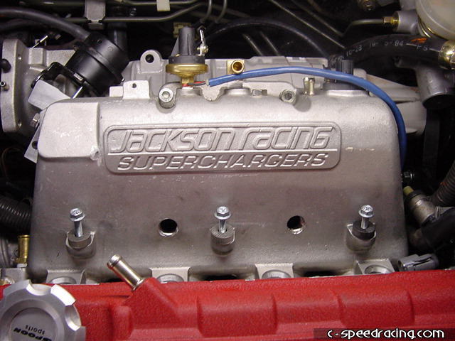 With the charger in place, you can now install the caps that fill the holes on the top of the manifold. You some silcone sealant on the threads to avoid vacuum leaks. Then reinstall the injectors and fuel rail. Be sure to apply a light coat of oil on the o-rings before inserting the injectors into the manifold. |