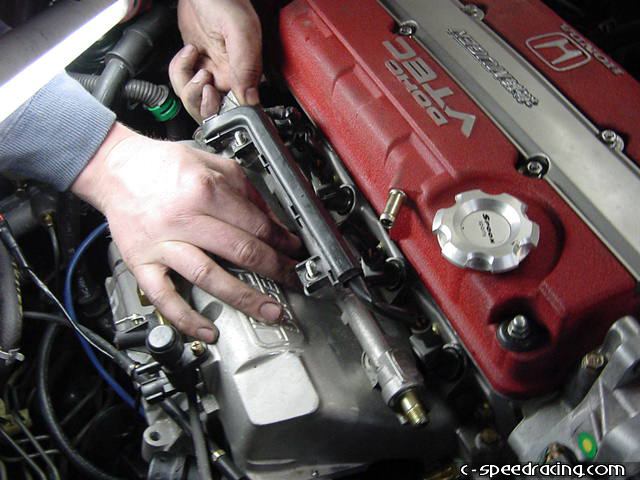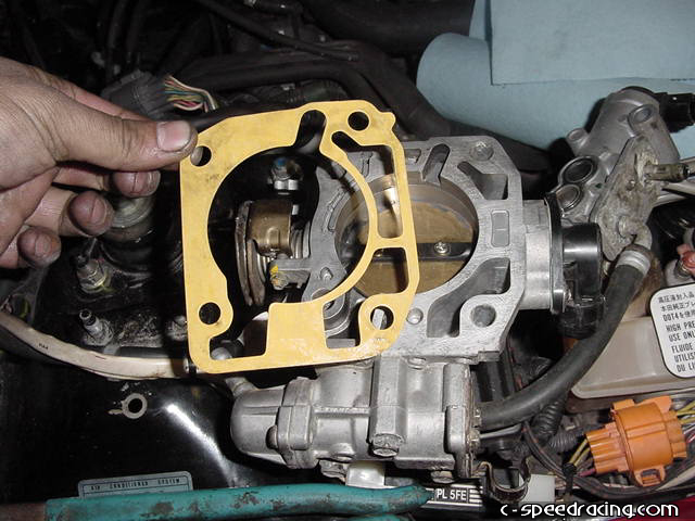 Use the new supplied spacers on the fuel rail before bolting it down. As with the intake gasket, apply a light coat of oil on the throttle body gasket. |
