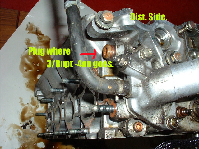 This is a plug in the back of the head. Remove this plug and replace it with a 3/8NPT to -4AN fitting. You will run your SS oil line from this location. Be sure to use teflon tape on the threads. |