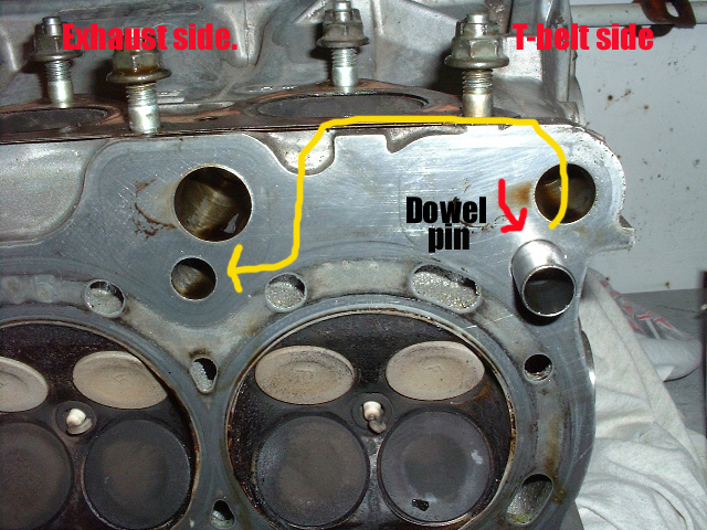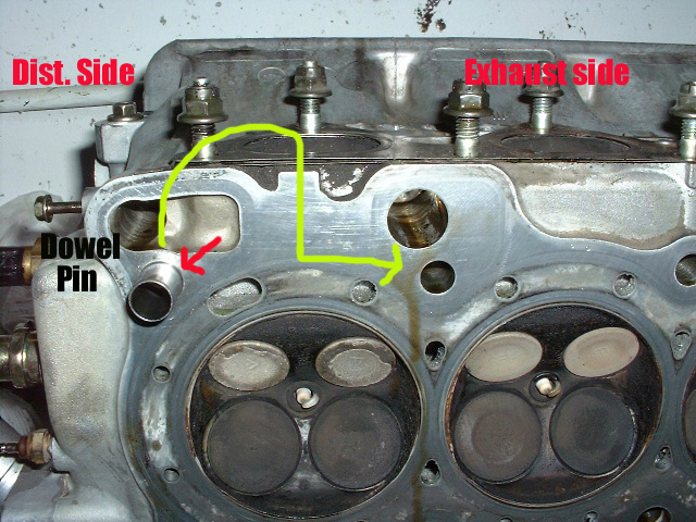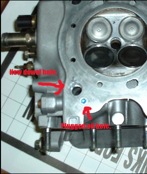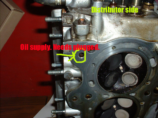 This is the oil supply hole. It is necessary to have it plugged. You may opt to have machine shop perform the task or if you are familiar with using a tap, you can do it yourself. Tap the hole with a 1/8NPT tap and plug the hole using a 1/8NPT plug. Be sure to use lock tite prior to screwing it in. If you damage the head, it will need to be resurfaced. Take your time. |