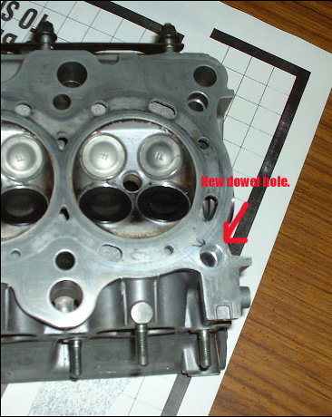 The second method to relocate the dowel pins is simpler. On the intake side of the head there are two locations on the left and right that are good for putting the dowel pins. All that is required using this method is that you resize the holes to fit the dowel pins. The LS headgasket already has the correctly sized holes, therefore there is no need to modify the headgasket. |