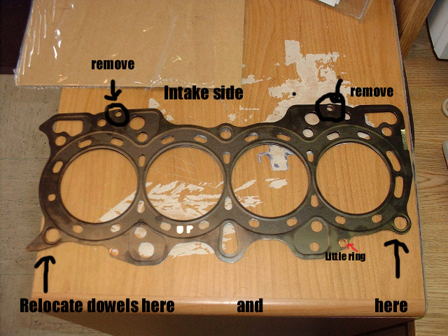 Here is a picture of the headgasket. The bottom left and bottom right hand corners are where the dowel pins go if you decided to use the second method. As you can see, the holes on the headgasket don't need to be modified. In some applications, the two brass rings labeled 'REMOVE' on a headgasket need to be removed, otherwise the head will sit on top of those and will not seal. Be absolutely sure you remove the two on the exhaust side only. |