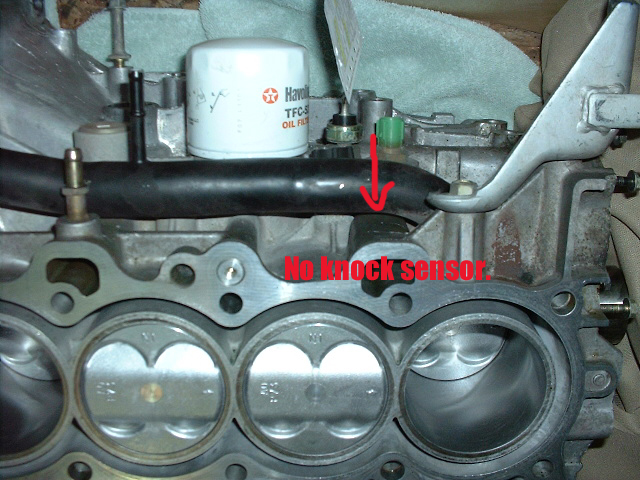 Pictured here is the back of a B18a block. Notice there is no knock sensor. The knock sensor came on the 92+ VTEC engines only. If your block doesn't have a knock sensor, you will need to located a hole for one. |