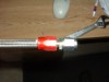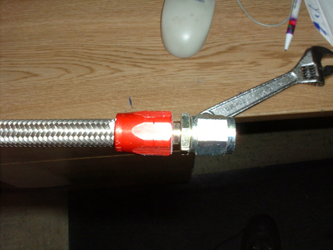 Now place the red housing of the AN fitting snugly over the SS line. To aid the next step, be sure to lubricate the inside of the SS line. Place the silver insert of the AN fitting inside the red housing. It may be easier to place the red housing in a vise. Cram SS line into the red housing and screw them together with a wrench. Repeat the process until you have two lines with the fittings securely attached on each end. |