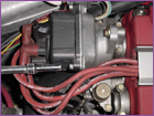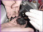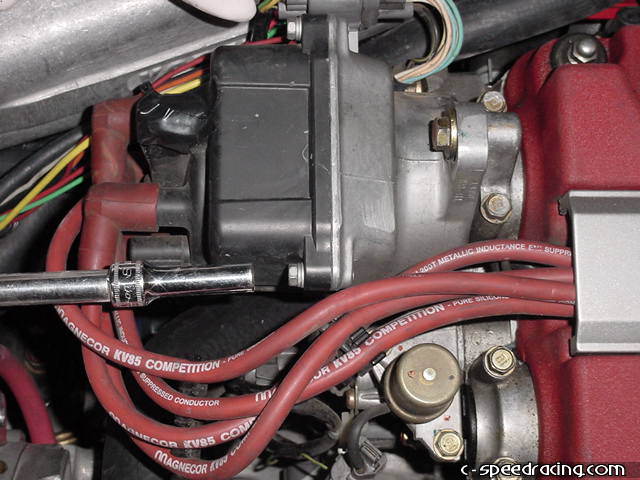 The first step is to remove the cap from the distributor. Loosen the three 8mm (philips) screws on the cap and carefully pull the cap away from the distributor. |