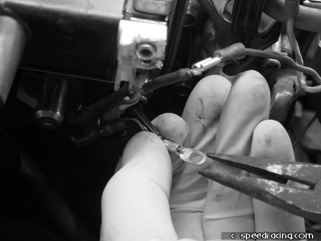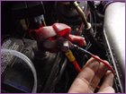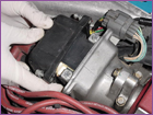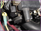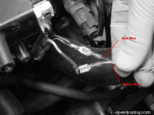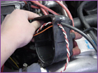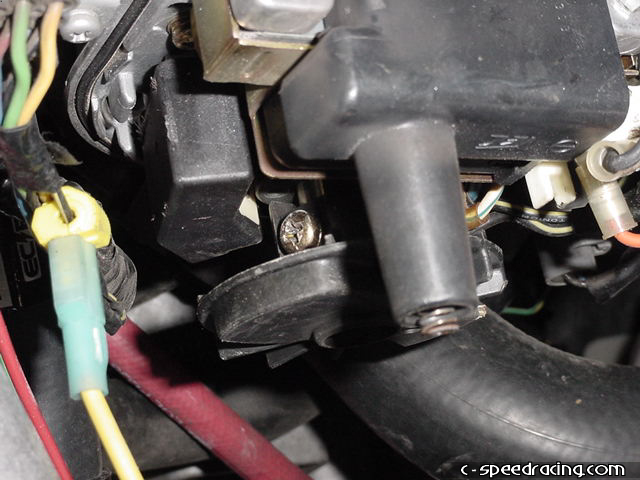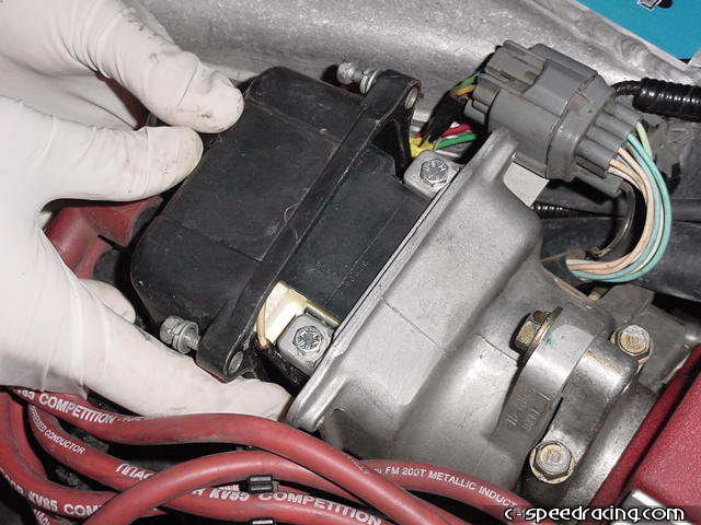 With the rotor off, now you can remove the plastic cover and expose the internal coil and wiring. You will see two small philips screws on the coil towards the top of the distributor. Remove them and carefully squeeze the end of the black/yellow stripe wire so that you can put a female spade onto it. |