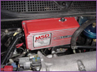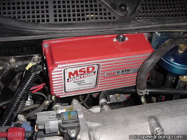 Then find a suitable location to mount the MSD box. Connect the thick red wire from the MSD to the positive side of the battery and connect the thick black wire from the MSD to a chassis ground. Run a vaccum line from the manifold to the nipple on the side of the MSD box. Then run the adjustment knob into the passenger compartment via a hole in the firewall. You can now return the ignition timing back to stock (16 degrees +/- 2 degrees) and use the 6BTM pull timing under boost. |