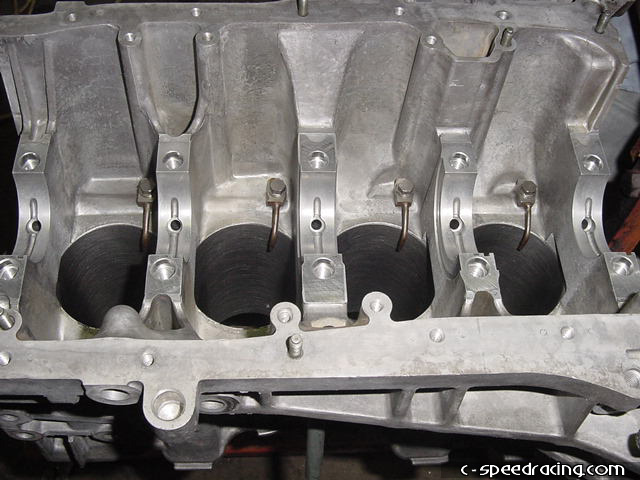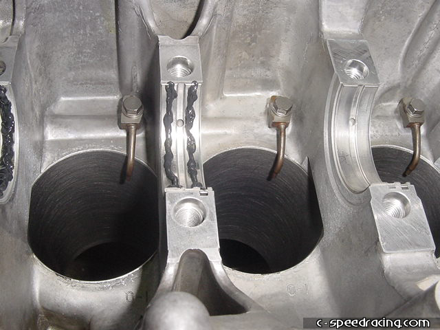 Once you know that the bearing clearances are to spec, you can go ahead and remove the gurdle and crank and lube up the crank bearings with pre-assembly lube and bolt the crank and gurdle back in. |