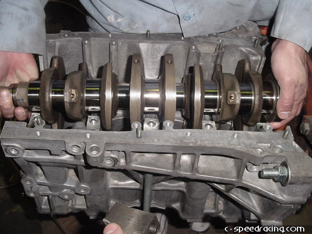 Once you have all the new bearings in place, carefully place the crank in position. Try not to move or rotate it while its in place since there isn't any lubrication. |