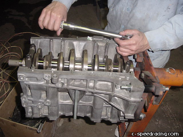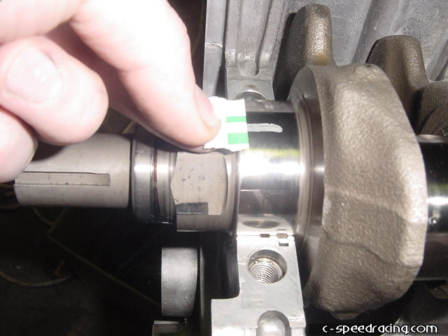 Now would also be good idea to plastigage the new crank bearings by bolting on the gurdle just to be sure that the bearings you purchased are putting you within spec. Also, carefully following the manufacturers torque specs, tighten each rod end cap down and also check the bearings to see if those are also within spec. We replace the factory GSR rod bolts with stronger ARP studs. |
