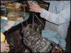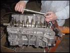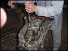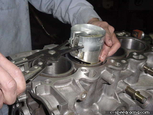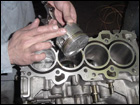With the crank in place, you can now go ahead and install the pistons and rods. Make sure you lube them up pretty good with engine oil and using a ring compressor and some steady hands, gently hammer the pistons into the cylinder. Be sure that they are all facing the correct direction! |