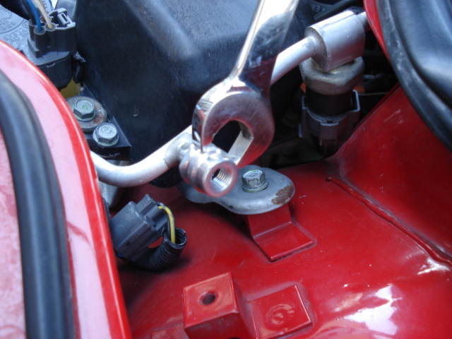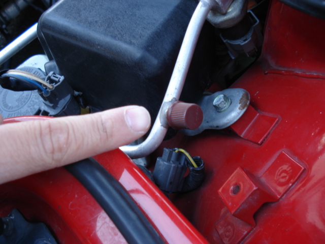 First, locate the high pressure line under the hood - it has a brown cap on it located by the driver side shock tower near the cruise control unit. The low pressure line is a larger diameter line located by the firewall near the climate control blower unit, just above and to the right of the battery location. |
