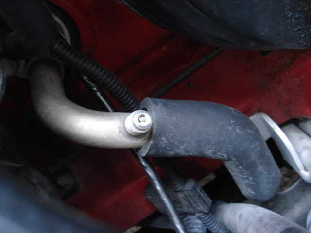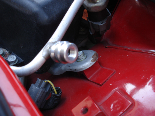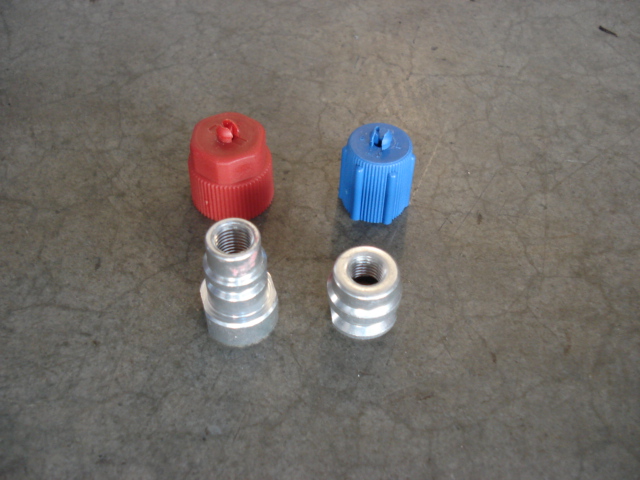 The picture on the left shows the high pressure line adapter fitting installed. The right picture shows the low pressure line with the adapter fitting installed. Thats it! You can now follow the instructions on a standard R-134A refill kit, or bring it to your local A/C refill station to have the existing R-12 refigerant evacuated and then refilled with new R-134A. |